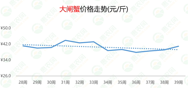 惠农大数据显示,大闸蟹市场交易火爆,价格连续3周上涨。第39周,大闸蟹的价格为40.9元/斤,较上周上涨5%,较去年同期下跌8%。