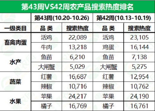 据惠农网平台对畜禽肉蛋、水产、蔬菜和水果4大农产品类目的重点监测与追踪,第43周,水产、蔬菜和水果排名前2位的品类与上周保持一致,仅畜禽肉蛋的排名有所调整:活鸡霸主地位尽显,连续多周稳居热搜榜冠军位;牛肉实力展现,时隔3周重返亚军位。