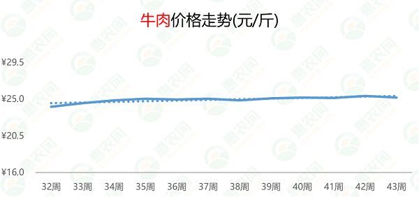 近12周,牛肉的周均变动幅度小,价格整体维持在25元/斤上下区间内调整。本周,牛肉的价格为25.2元/斤,环比轻微下跌1%,但同比上涨8%。