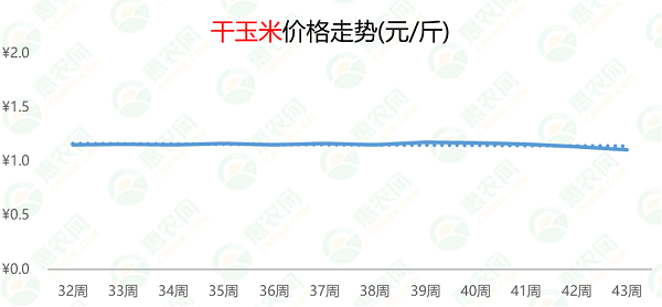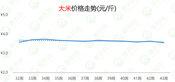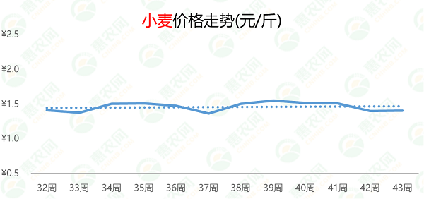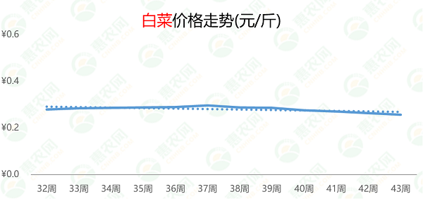 自9月下旬起,白菜市场价格持续下跌,但跌幅不大。第43周,白菜的价格为0.3元/斤,环比、同比分别下跌3%和25%。