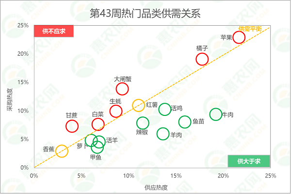 分析惠农网平台热门品类的供需关系:苹果、橘子、大闸蟹和生蚝等6个品类的供应相对偏紧;红薯和香蕉的供需相对稳定;甲鱼、活羊、辣椒和牛肉等8个品类的供应相对充足。