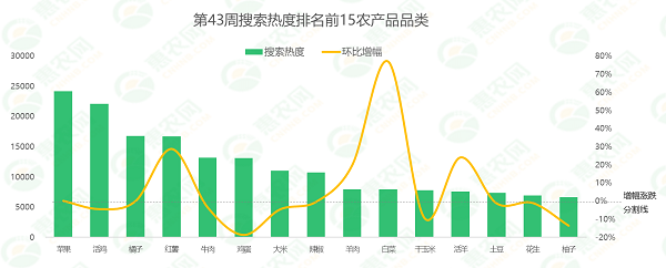 从环比增幅来看,第43周排名前15的农产品品类的市场关注度以跌居多。红薯、羊肉、白菜和活羊等4个品类的搜索热度实现增长,活鸡、牛肉、鸡蛋和大米等8个品类的搜索热度有所下滑,苹果、橘子和辣椒的搜索热度基本持平上周。具体细分到品类,白菜的市场关注度逐周攀升,本周环比大涨77%,再次领跑其他品类;鸡蛋的市场关注度跌幅较为靠前,环比下跌19%。