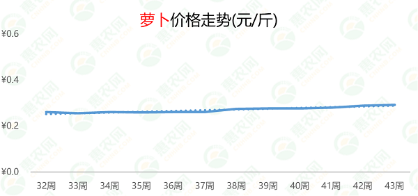 虽然当前萝卜的价格低于去年同期,但整体来看呈涨势。第43周,萝卜的周均价为0.3元/斤,与上周相比上涨1%,与第32周相比上涨13%;但与去年同期相比下跌8%。
