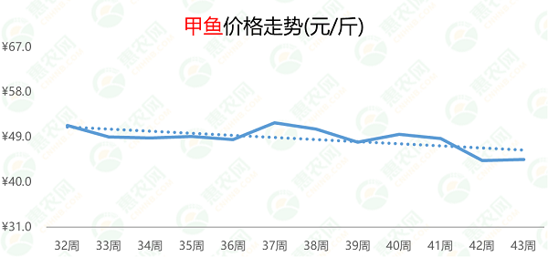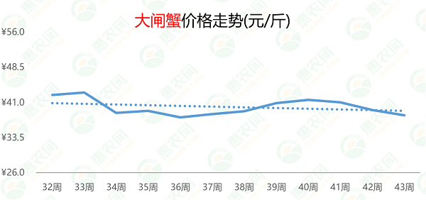 当前,大闸蟹价格仍在继续下跌,且较节日期间的41.6元/斤下跌3.3元/斤,跌幅为8%。第43周,大闸蟹的周均价为38.3元/斤,环比、同比均出现下滑,跌幅分别为3%和7%。