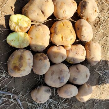 8月13日,原平市红池村民正在土豆地里查看长势,两人看着喜人的土豆开心的笑了。原平市山区农民根据土地土壤结构松散的特点,以种植土豆为主要农作物,不分地块大小,也不论坡地还是平地,长出的土豆个头大好吃,既可以当主食食用,也可以制作为蔬菜,一食多用,是餐桌上的香饽饽,销售价格也节节攀升,是山区百姓脱贫致富的金圪蛋。